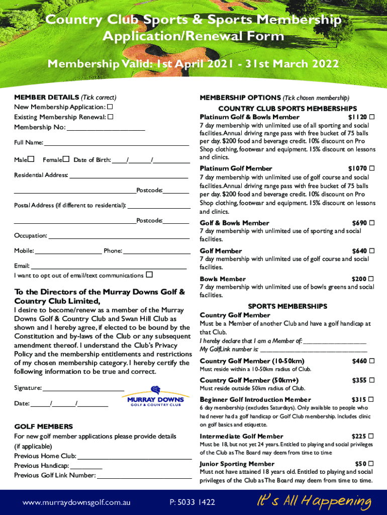 Country Club Sports & Sports Membership Application/Renewal Form Membership Valid: 1st April 2021 31st March 2022 MEMBER DETAILS (Tick correct) New Membership Application: Existing Membership Renewal: