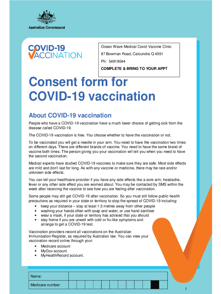 Ocean Wave Medical COVID-19 Vaccine Clinic 87 Bowman Road, Alondra Q 4551 pH: 54919044 COMPLETE & BRING TO YOUR APPTConsent form for COVID-19 vaccination About COVID-19 vaccination People who have