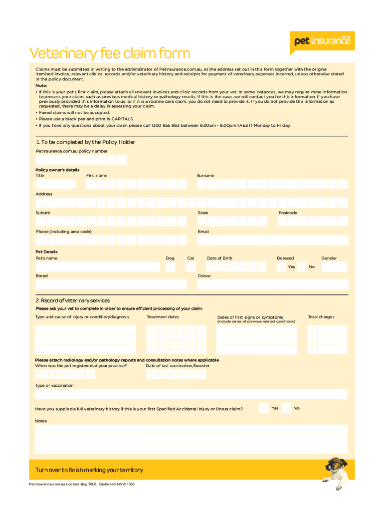 Veterinary fee claim form Claims must be submitted in writing to the administrator of Petinsurance.com.AU, at the address set out in this form together with the original itemized invoice, relevant