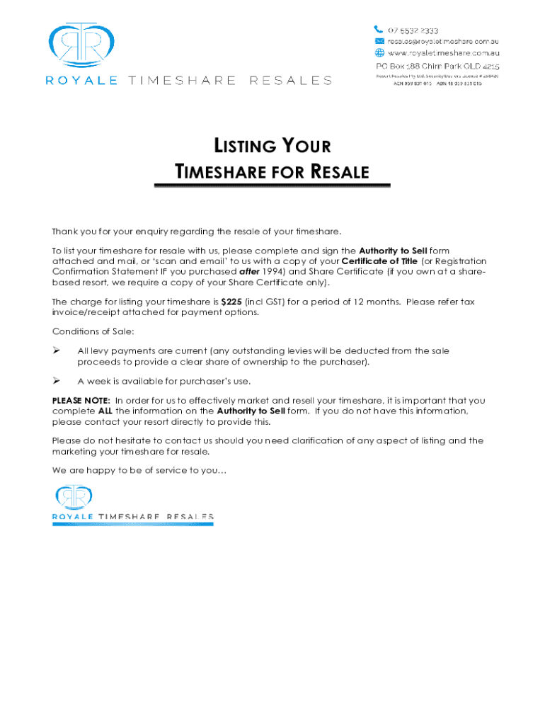 LISTING YOUR TIMESHARE FOR RESALE Thank you for your inquiry regarding the resale of your timeshare. To list your timeshare for resale with us, please complete and sign the Authority to Sell form