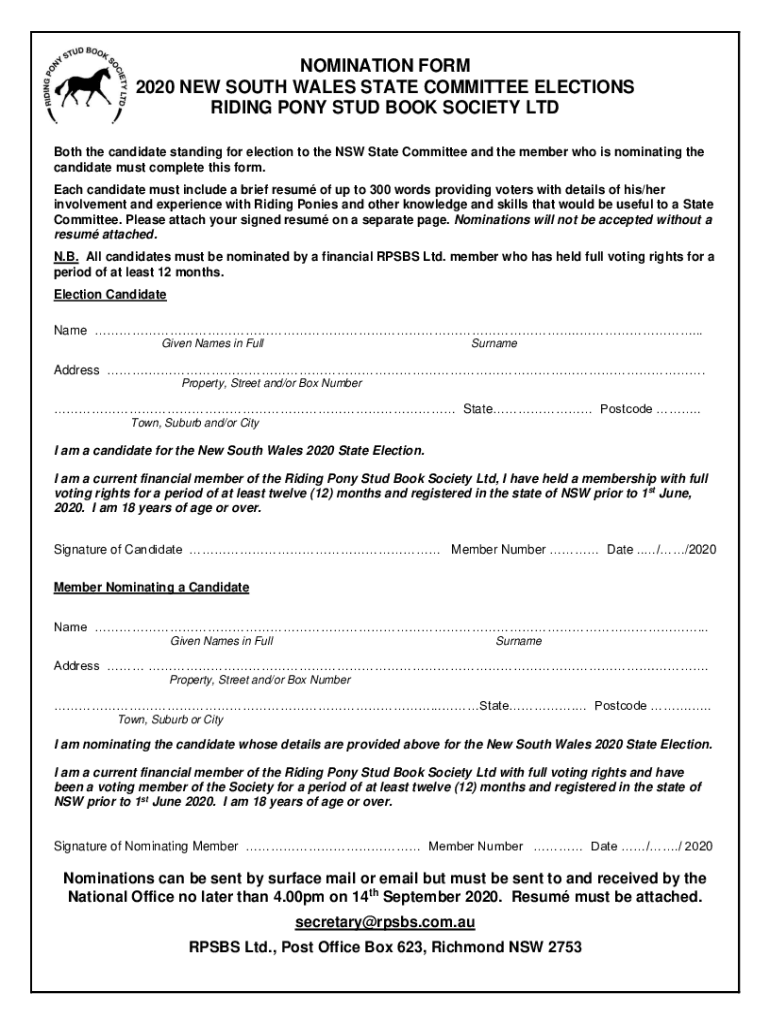 NOMINATION FORM 2020 NEW SOUTH WALES STATE COMMITTEE ELECTIONS RIDING PONY STUD BOOK SOCIETY LTD Both the candidate standing for election to the NSW State Committee and the member who is nominating