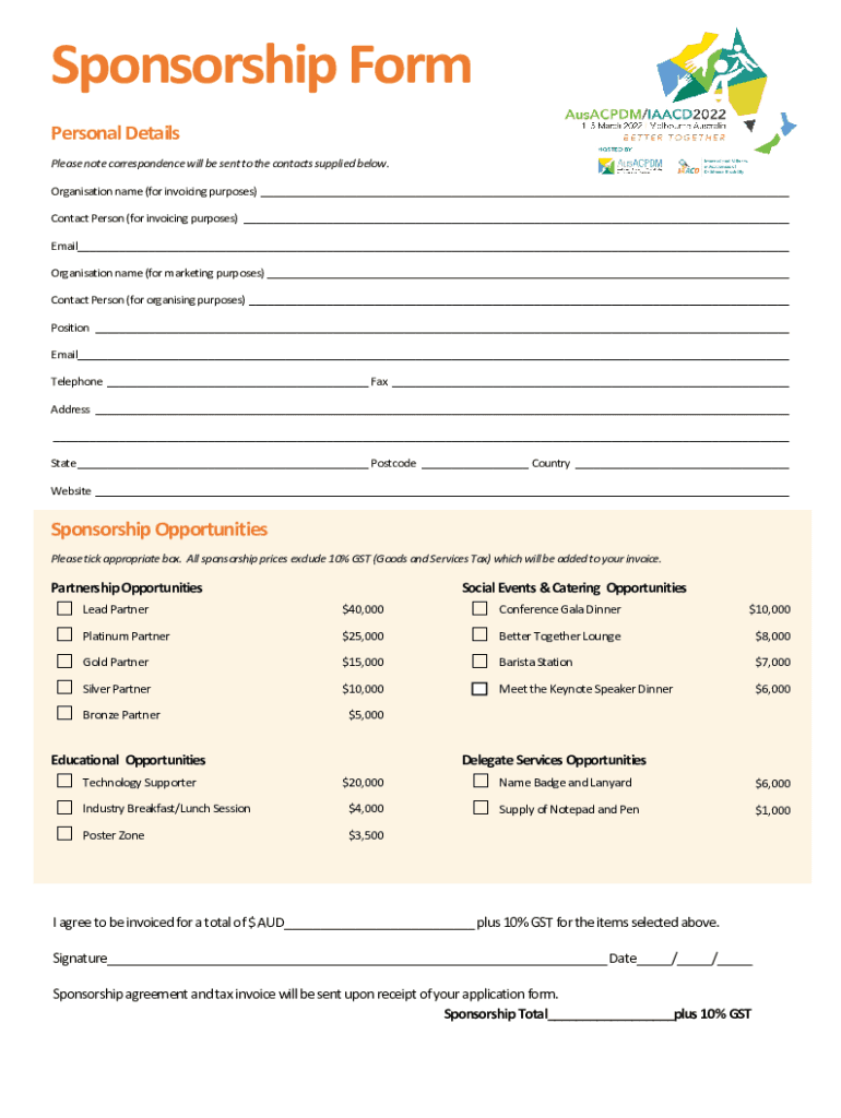 Sponsorship Form Personal Details Please note correspondence will be sent to the contacts supplied below. Organization name (for invoicing purposes) Contact Person (for invoicing purposes) Email Organization
