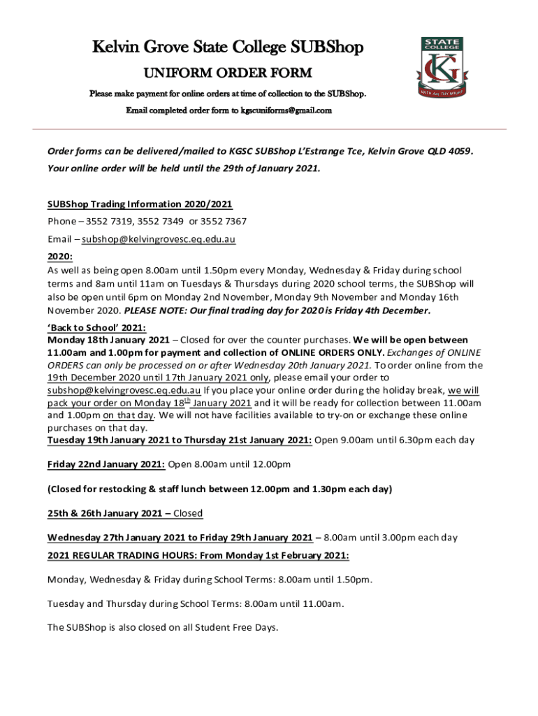 Kelvin Grove State College SUBS hop UNIFORM ORDER FORM Please make payment for online orders at time of collection to the SUBS hop. Email completed order form to kgscuniforms@gmail.comOrder forms