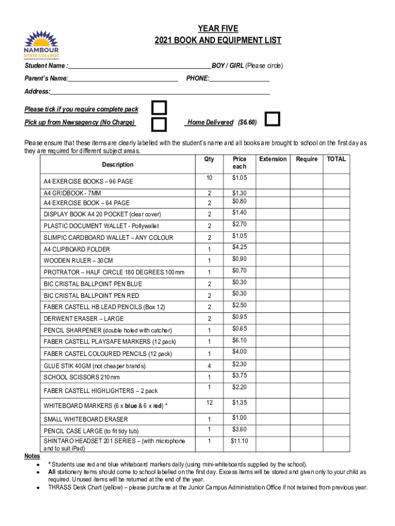 YEAR FIVE 2021 BOOK AND EQUIPMENT LIST Student Name : BOY / GIRL (Please circle) Parents Name: PHONE: Address: Please tick if you require complete pack Pick up from News agency (No Charge)Home Delivered