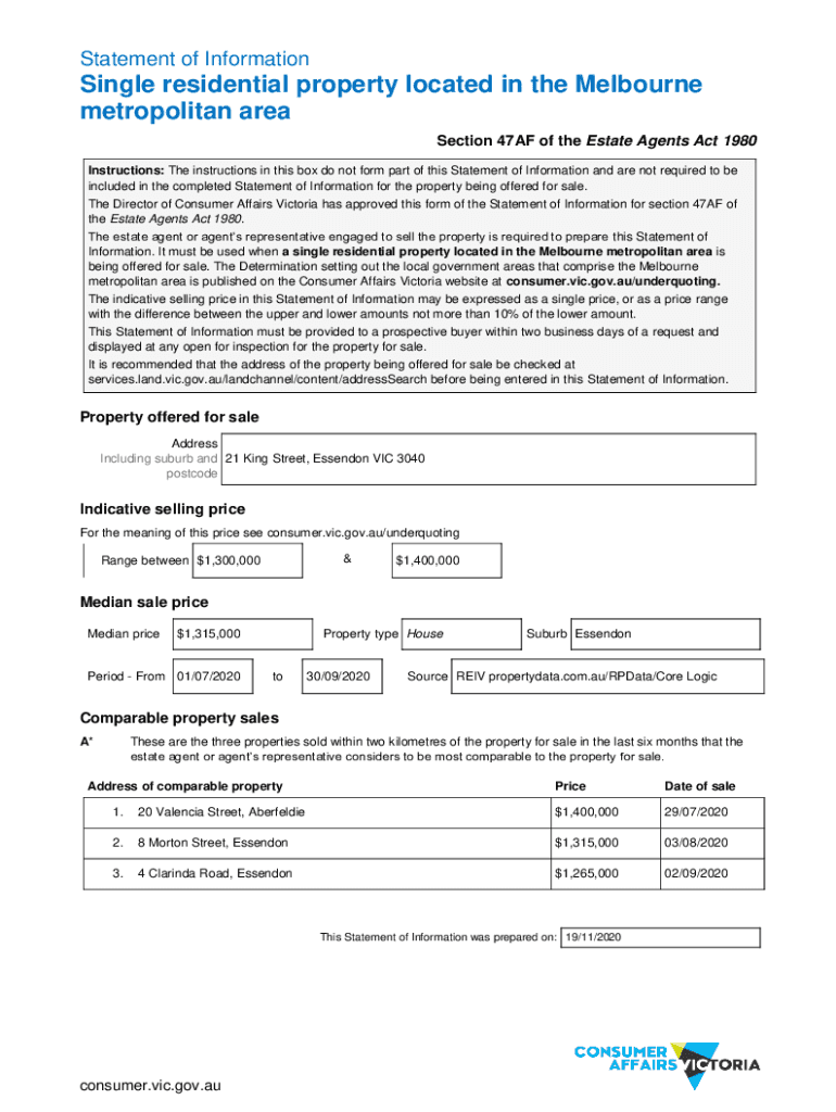 Statement of InformationSingle residential property located in the Melbourne metropolitan area Section 47AF of the Estate Agents Act 1980 Instructions: The instructions in this box do not form part
