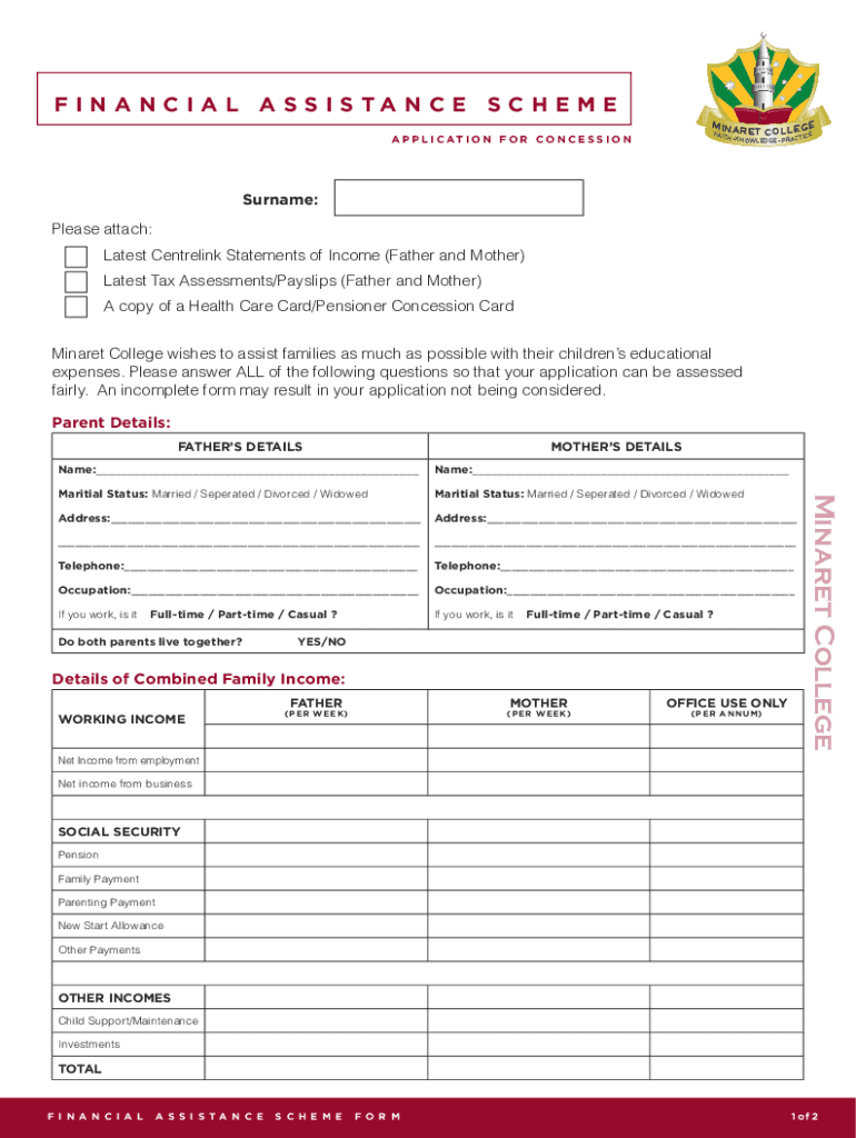 F I N A N C I A L A S S I S TA N C E S C H E M E MINEFI ARE COLL ECE I H KNOW LEDGE PR ACTA P L I C AT I O N F O R C O N C E S S I ON Surname: Please attach:Latest Centrelink Statements of Income