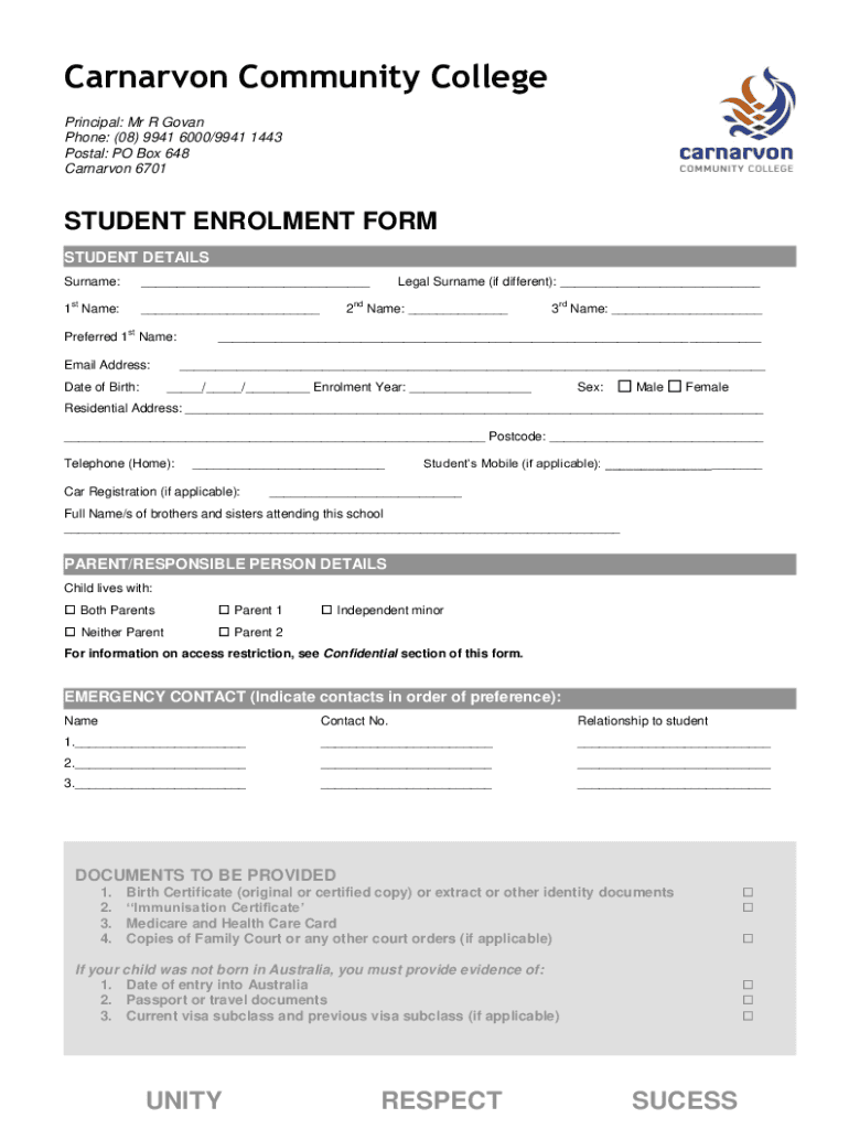 Carnation Community College Principal: Mr R Golan Phone: (08) 9941 6000/9941 1443 Postal: PO Box 648 Carnation 6701STUDENT Enrollment FORM STUDENT DETAILS Surname: st1 Name: preferred 1 Name: Email
