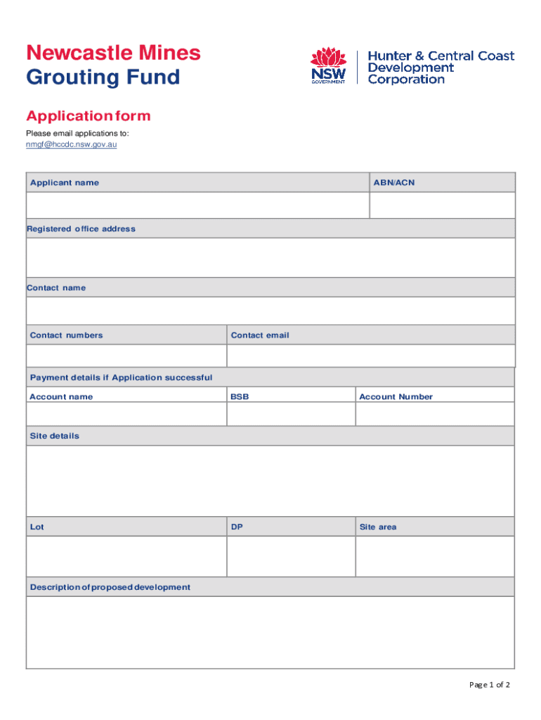 Newcastle Mines Grouting Fund Application form Please email applications to: nmgf@hccdc.nsw.gov.auApplicant name ABN/Unregistered office addressContact recontact numbersContact emailPayment details
