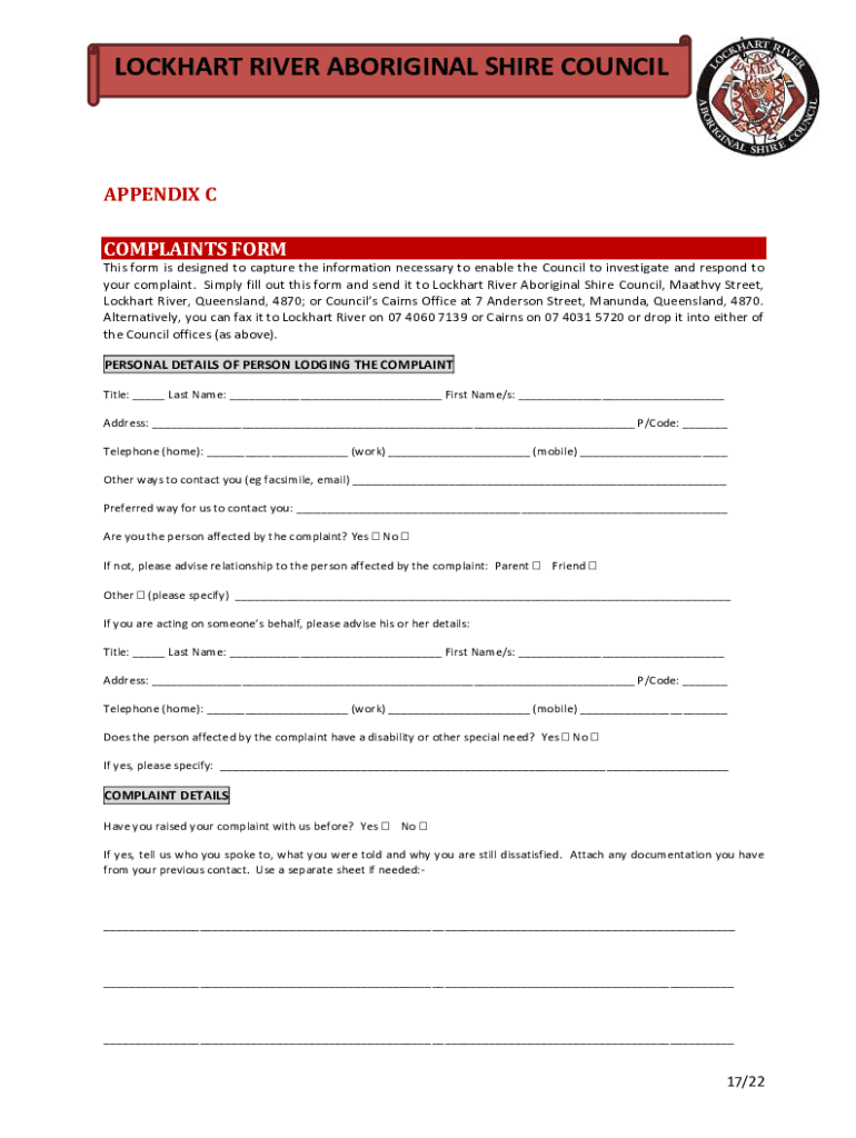 LOCKHART RIVER ABORIGINAL SHIRE COUNCILAPPENDIX C COMPLAINTS FORM This form is designed to capture the information necessary to enable the Council to investigate and respond to your complaint. Simply