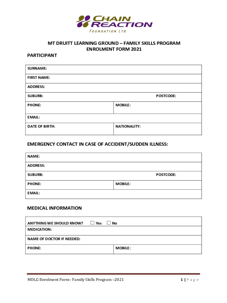 MT PRUITT LEARNING GROUND FAMILY SKILLS PROGRAM Enrollment FORM 2021 PARTICIPANT SURNAME: FIRST NAME: ADDRESS: SUBURB: PHONE:POSTCODE: MOBILE:EMAIL: DATE OF BIRTH:NATIONALITY:EMERGENCY CONTACT IN