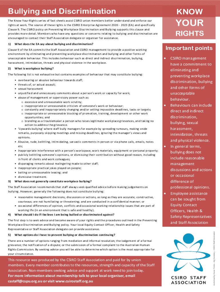 Bullying and DiscriminationKNOWThe Know Your Rights series of fact sheets assist CAIRO union members better understand and enforce our rights at work. The source of these rights is the CAIRO Enterprise