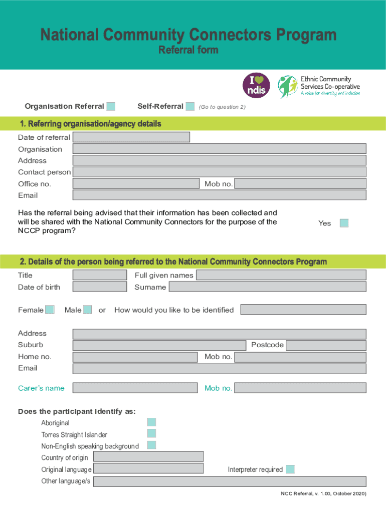 National Community Connectors Program Referral formOrganisation ReferralSelfReferral(Go to question 2)1. Referring organization/agency details Date of referral Organization Address Contact person