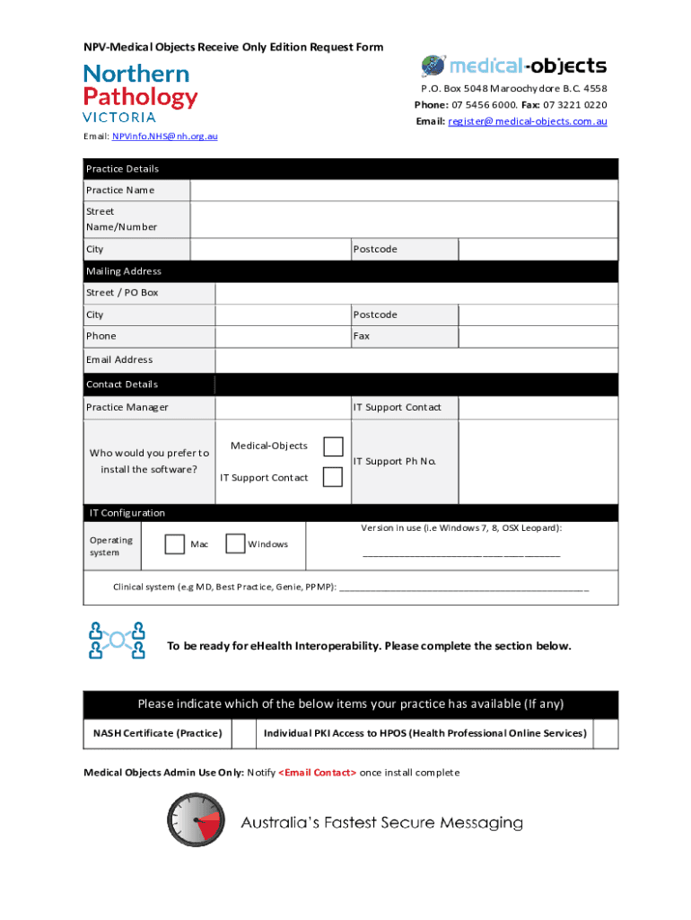 Nonmedical Objects Receive Only Edition Request Form P.O. Box 5048 Maroochydore B.C. 4558 Phone: 07 5456 6000. Fax: 07 3221 0220 Email: register@medicalobjects.com.au Email: NPVinfo.NHS@nh.org.auPractice