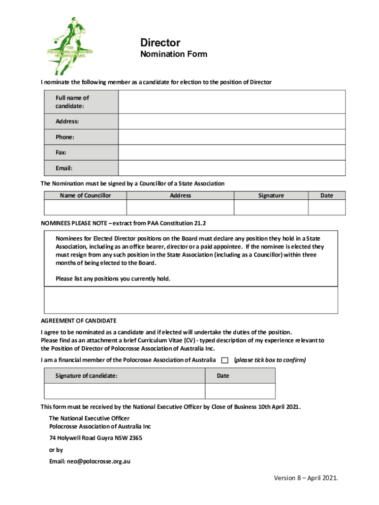 Director Nomination Form I nominate the following member as a candidate for election to the position of Director Full name of candidate: Address: Phone: Fax: Email: The Nomination must be signed by