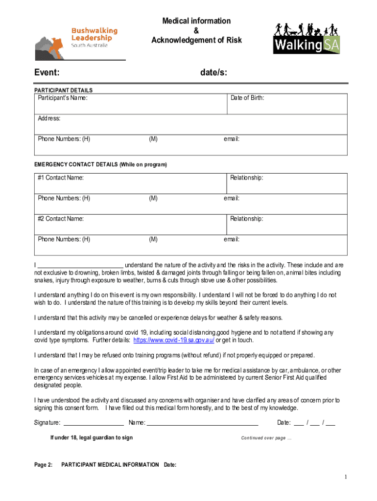 Medical information & Acknowledgement of Riskiest:date/s:PARTICIPANT DETAILSParticipants Name:Date of Birth:Address: Phone Numbers: (H)(M)email:EMERGENCY CONTACT DETAILS (While on program)#1 Contact
