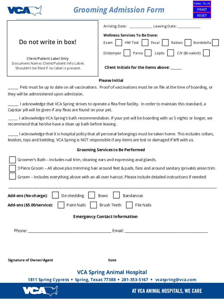 Get the free PDF Grooming Admission Form - VCA Animal Hospitals