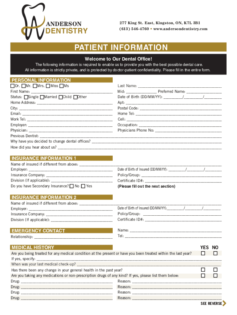 ANDERSONDENTISTRY277 King St. East, Kingston, ON, K7L 3B1 (613) 5464760 www.andersondentistry.comPATIENT INFORMATION Welcome to Our Dental Office! The following information is required to enable us