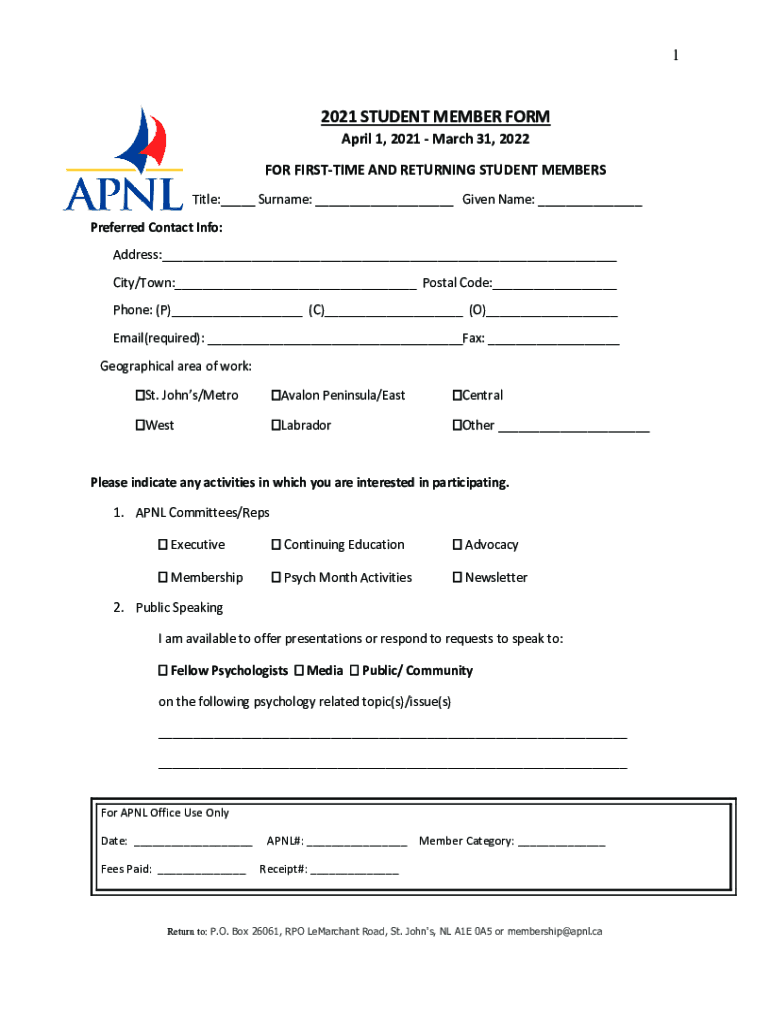 12021 STUDENT MEMBER FORM April 1, 2021, March 31, 2022FOR FIRST TIME AND RETURNING STUDENT MEMBERS Title: Surname: Given Name: Preferred Contact Info: Address: City/Town: Postal Code: Phone: (P)