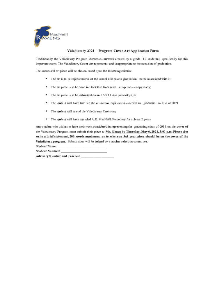 Valedictory 2021 Program Cover Art Application Form Traditionally the Valedictory Program showcases artwork created by a grade 12 student(s) specifically for this important event. The Valedictory