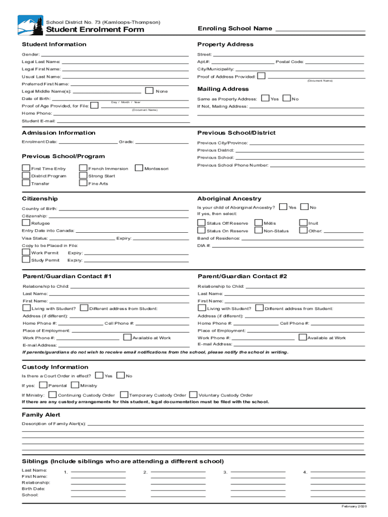 School District No. 73 (KamloopsThompson)Student Enrollment FormEnroling School NameStudent InformationProperty AddressGender:Street:Legal Last Name:Apt.#:Legal First Name:City/Municipality:Usual