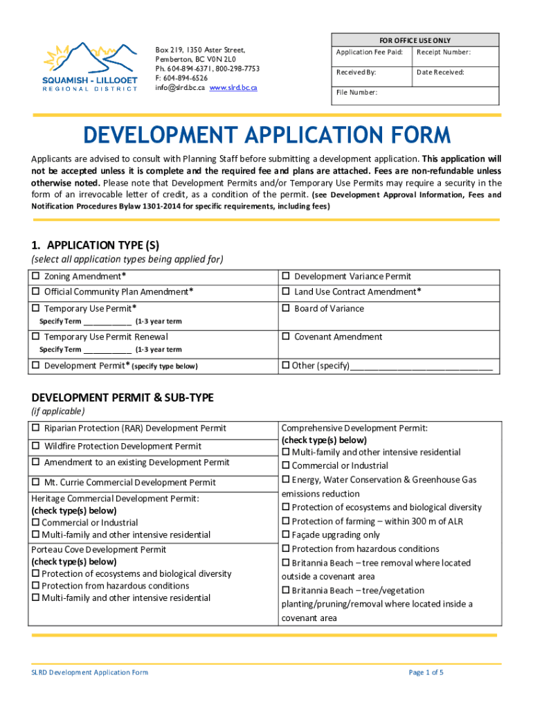 FOR OFFICE USE ONLY Application Fee Paid: Receipt Number:Box 219, 1350 Aster Street, Pemberton, BC V0N 2L0 pH. 6048946371, 8002987753 F: 6048946526 info@slrd.bc.ca www.slrd.bc.caReceived By:Date Received:File