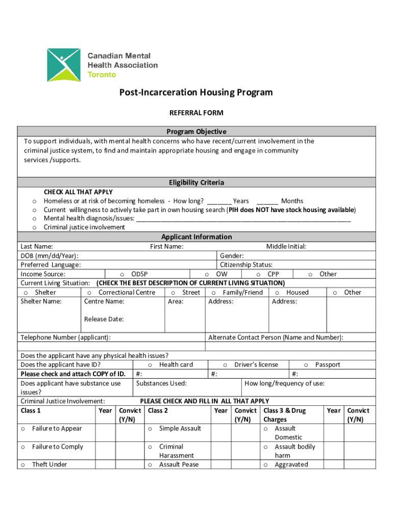 PostIncarceration Housing Program REFERRAL FORM Program Objective To support individuals, with mental health concerns who have recent/current involvement in the criminal justice system, to find and