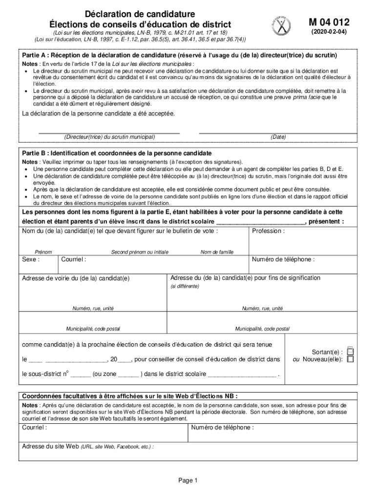 Effaced Declaration DE candidature elections DE contains education DE district 04 012 (20200204)(LOI SUR LES elections municipals, LNB, 1979, c. M21.01 art. 17 ET 18) (LOI SUR education, LNB, 1997,