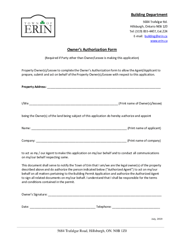 Building Department 5684 Trafalgar Rd. Hills burgh, Ontario N0B 1Z0 Tel: (519) 8554407, Ext.224 Email: building Erin.ca www.erin.caOwners Authorization Form (Required if Party other than Owner/Lessee
