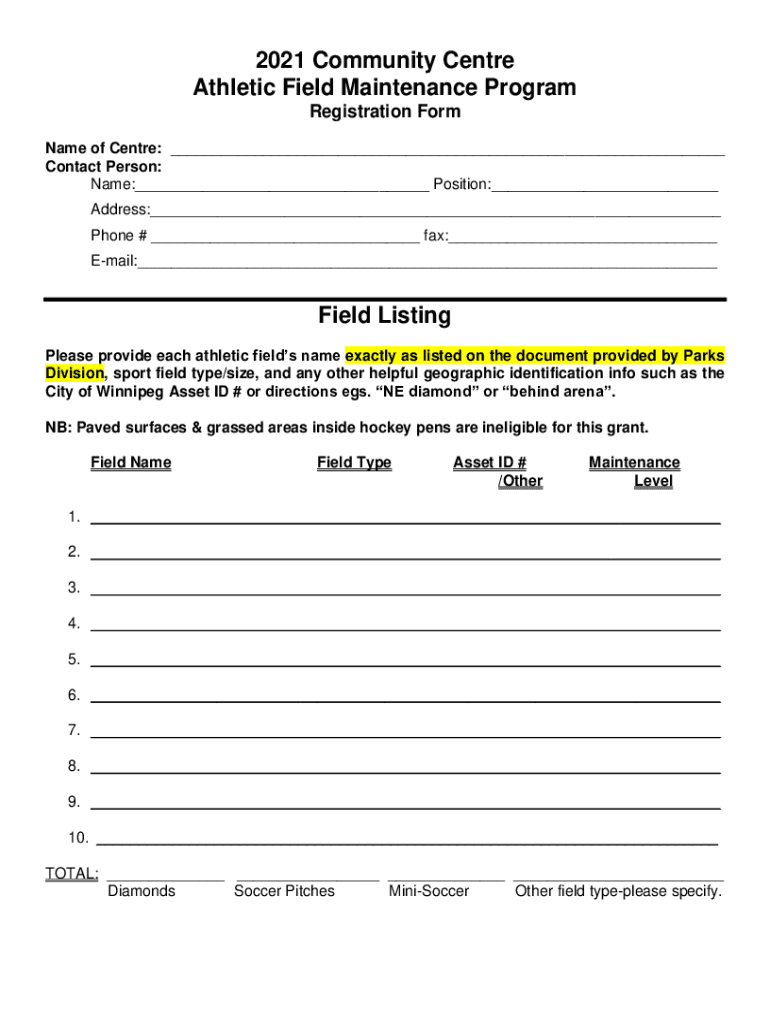 2021 Community Center Athletic Field Maintenance Program Registration Form Name of Center: Contact Person: Name: Position: Address: Phone # fax: Email: Field Listing Please provide each athletic fields