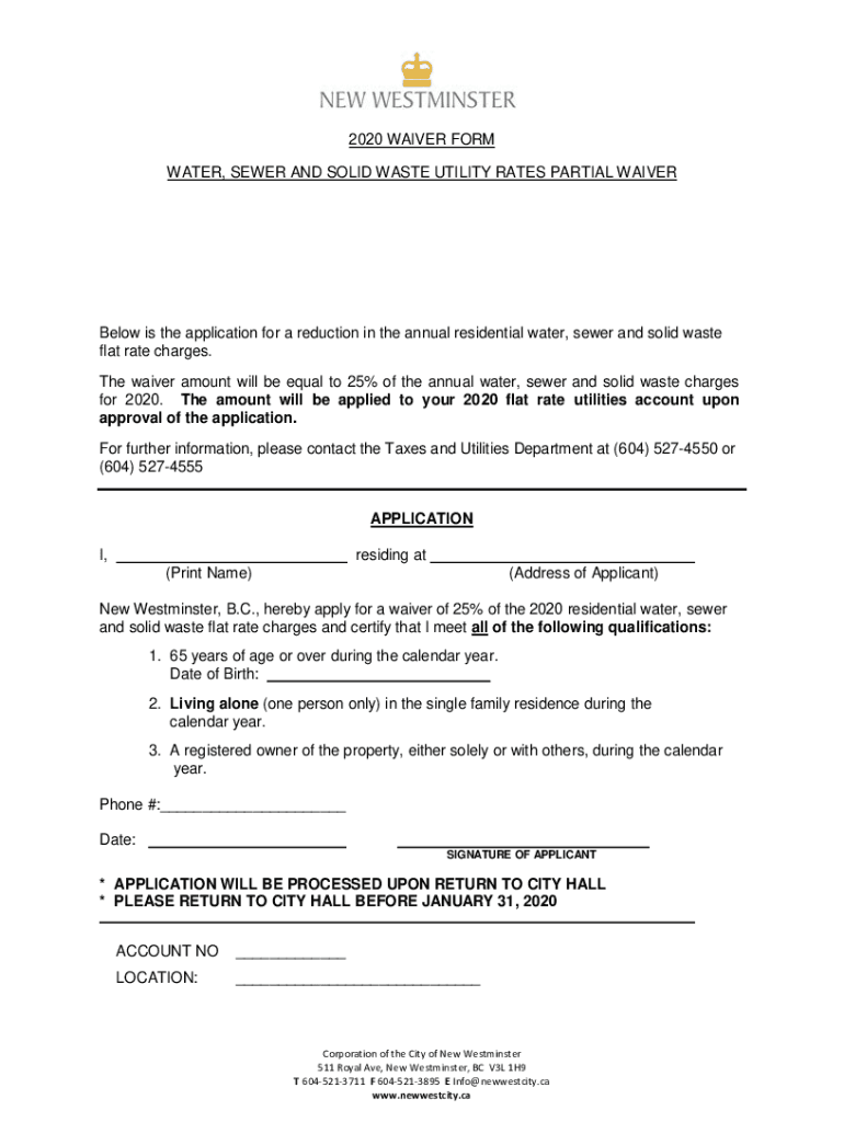 2020 WAIVER FORM WATER, SEWER AND SOLID WASTE UTILITY RATES PARTIAL WAIVERBelow is the application for a reduction in the annual residential water, sewer and solid waste flat rate charges. The waiver