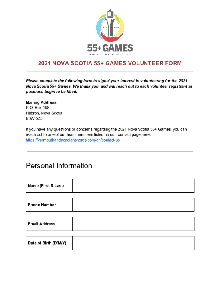 2021 NOVA SCOTIA 55+ GAMES VOLUNTEER FORM Please complete the following form to signal your interest in volunteering for the 2021 Nova Scotia 55+ Games. We thank you, and will reach out to each volunteer