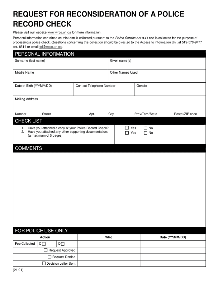 REQUEST FOR RECONSIDERATION OF A POLICE RECORD CHECK Please visit our website www.wrps.on.ca for more information. Personal information contained on this form is collected pursuant to the Police Service