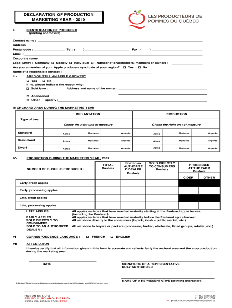 DECLARATION OF PRODUCTION MARKETING YEAR 2019 IDENTIFICATION OF PRODUCER (printing characters)Contact name : Address Postal code :Tel : ()Fax : ()Email : Corporate name : Legal Entity : Company Society