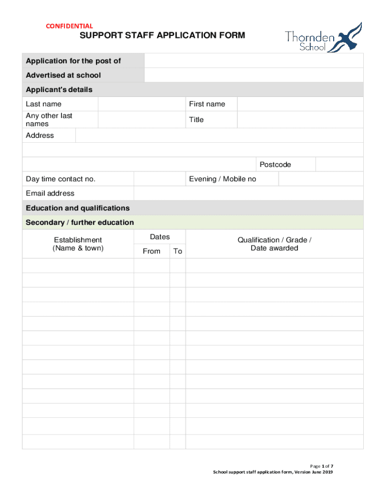 CONFIDENTIALSUPPORT STAFF APPLICATION FORM Application for the post of Advertised at school Applicant's details Last nameFirst namely other last namesTitleAddressPostcode Day time contact no. Evening