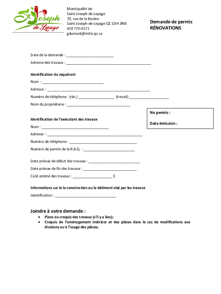 Municipality de SaintJosephdeLepage 70, rue DE la Riv ire SaintJosephdeLepage QC G5H 3N8 418 7754171 DuMont mites.QC.demand DE permit RNOVATIONSDate de la demand : Address DES travail : Identification