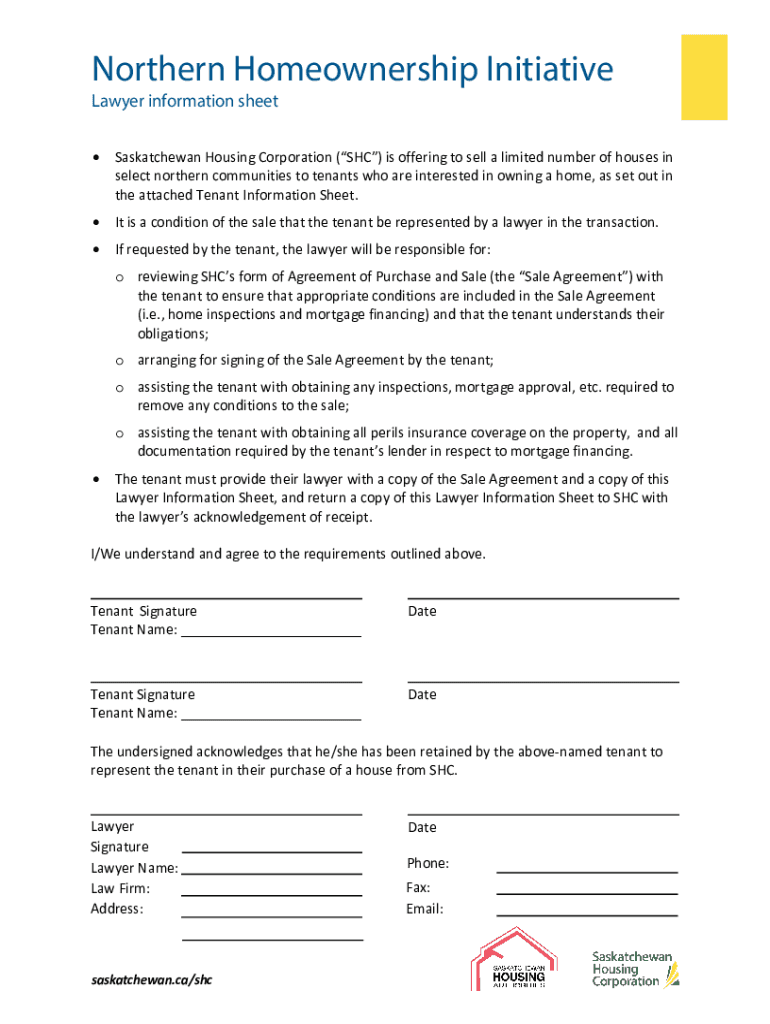 Northern Homeownership Initiative Lawyer information sheet Saskatchewan Housing Corporation (SHE) is offering to sell a limited number of houses in select northern communities to tenants who are interested