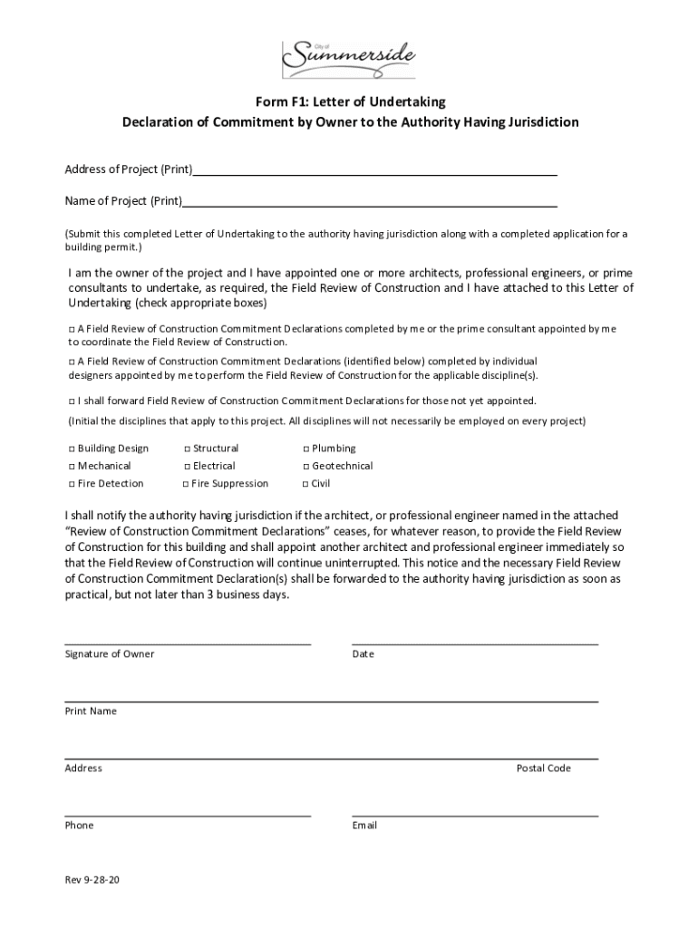 Form F1: Letter of Undertaking Declaration of Commitment by Owner to the Authority Having Jurisdiction Address of Project (Print) Name of Project (Print) (Submit this completed Letter of Undertaking