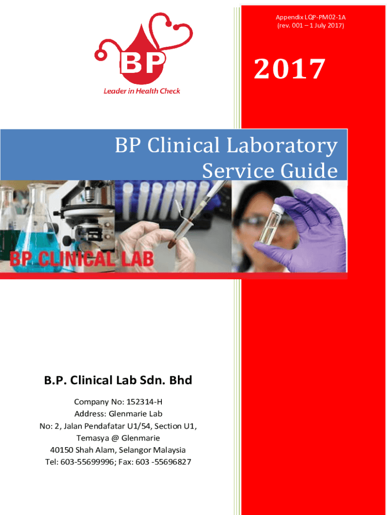 Appendix LQPPM021A (rev. 001 1 July 2017)2017 BP Clinical Laboratory Service Guide. P. Clinical Lab SDN. BHD Company No: 152314H Address: Glendale Lab No: 2, Japan Pendafatar U1/54, Section U1, Temary