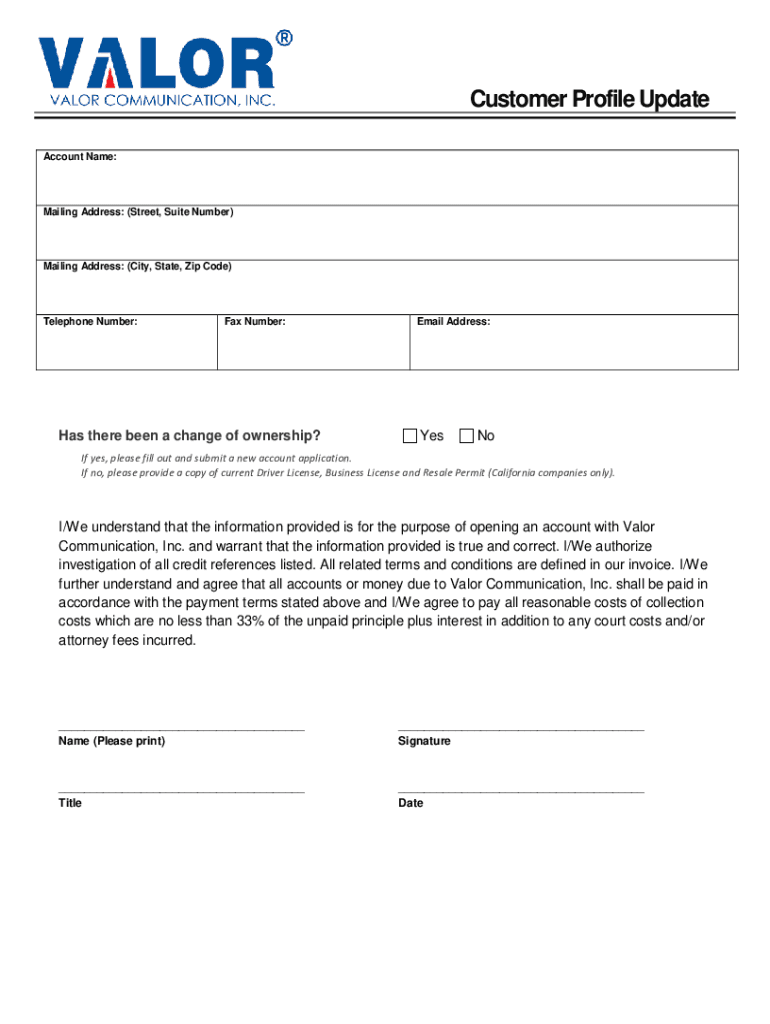 Customer Profile Update Account Name:Mailing Address: (Street, Suite Number)Mailing Address: (City, State, Zip Code)Telephone Number:Fax Number:Has there been a change of ownership? Email Address: