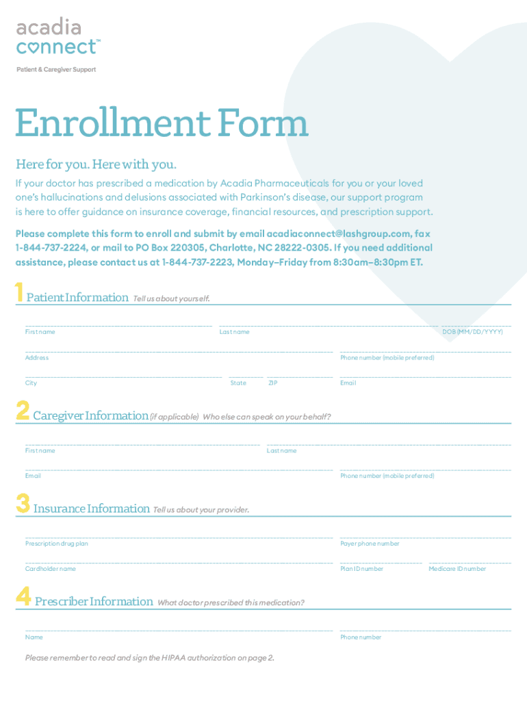 Enrollment Form Here for you. Here with you. If your doctor has prescribed a medication by Acadia Pharmaceuticals for you or your loved one's hallucinations and delusions associated with Parkinson's