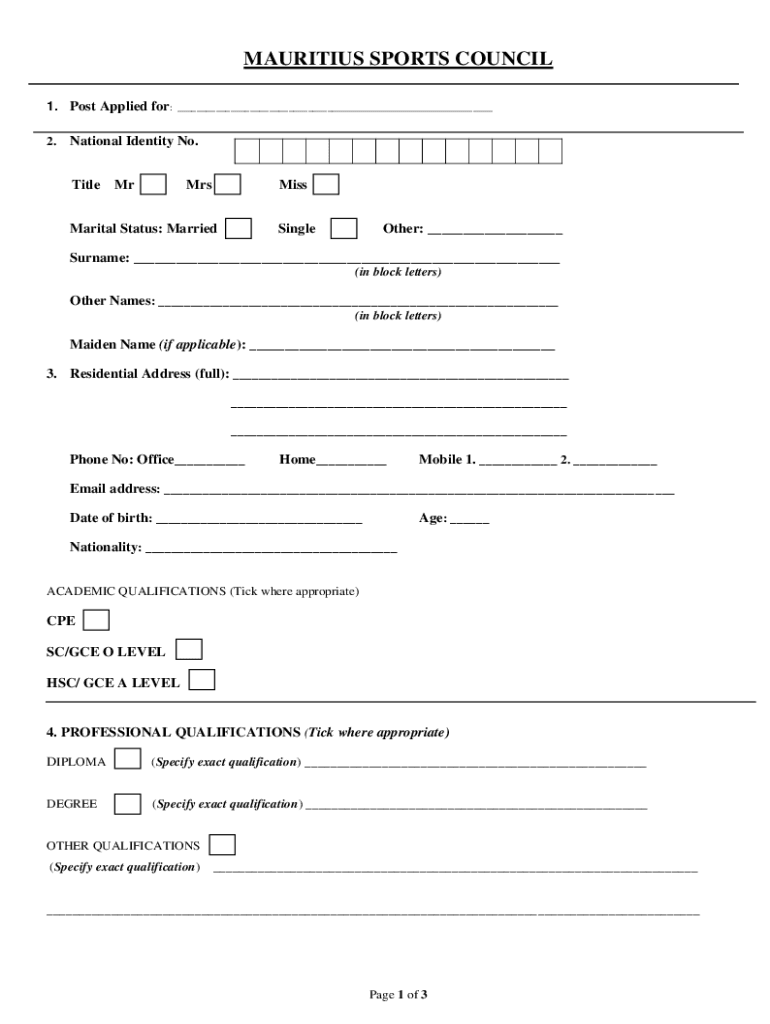 MAURITIUS SPORTS COUNCIL 1. Post Applied for: 2. National Identity No. Title MrMrsMissMarital Status: MarriedSingleOther: Surname: (in block letters)Other Names: (in block letters)Maiden Name (if