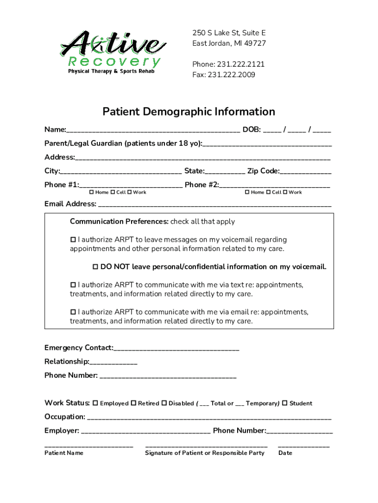 250 S Lake St, Suite E East Jordan, MI 49727 Phone: 231.222.2121 Fax: 231.222.2009Patient Demographic Information Name: DOB: / / Parent/Legal Guardian (patients under 18 yo): Address: City: State: