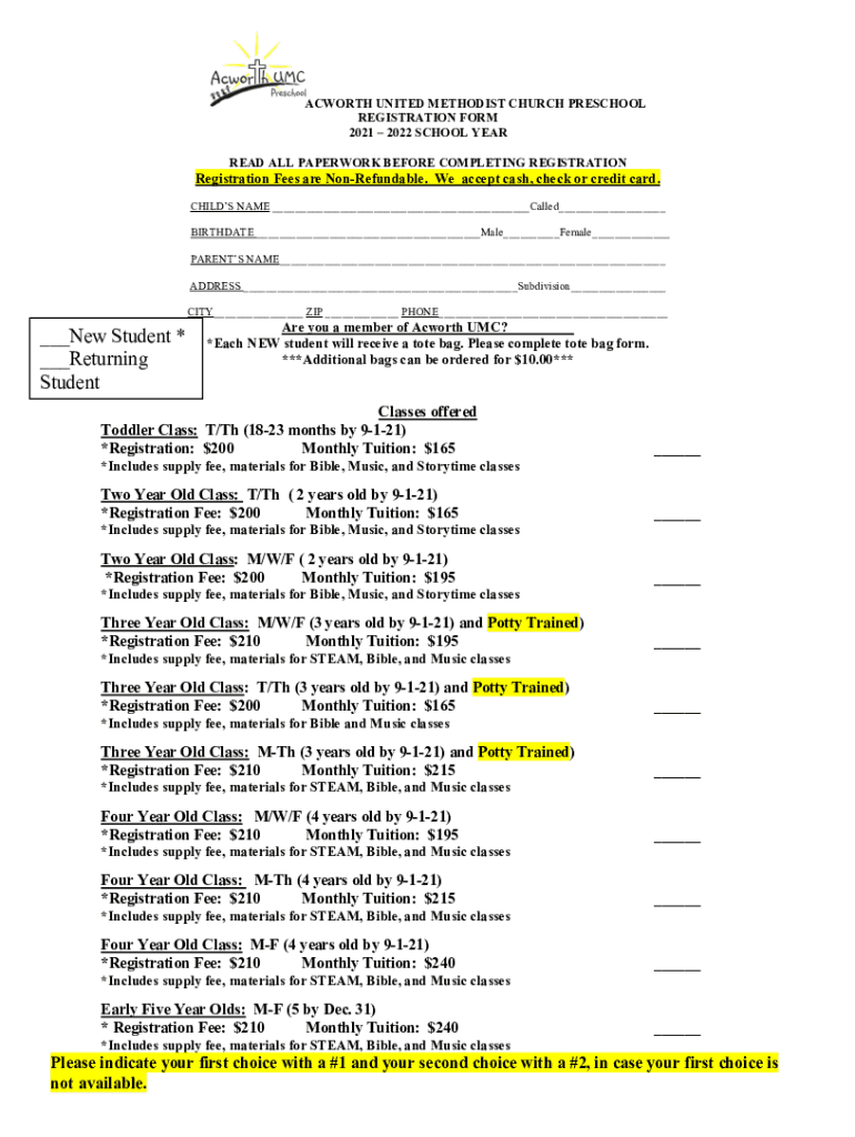 WORTH UNITED METHODIST CHURCH PRESCHOOL REGISTRATION FORM 2021 2022 SCHOOL YEAR READ ALL PAPERWORK BEFORE COMPLETING REGISTRATIONRegistration Fees are NonRefundable. We accept cash, check or credit