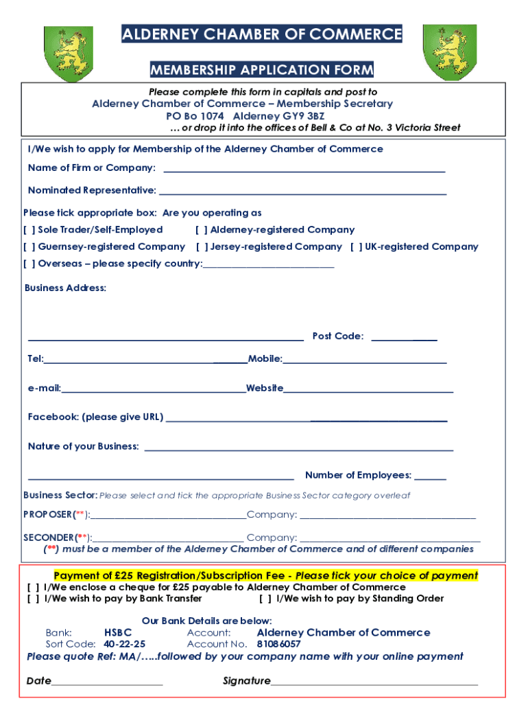 ALDERNEY CHAMBER OF COMMERCE MEMBERSHIP APPLICATION FORM Please complete this form in capitals and post Alderney Chamber of Commerce Membership Secretary PO BO 1074 Alderney GY9 3BZ or drop it into