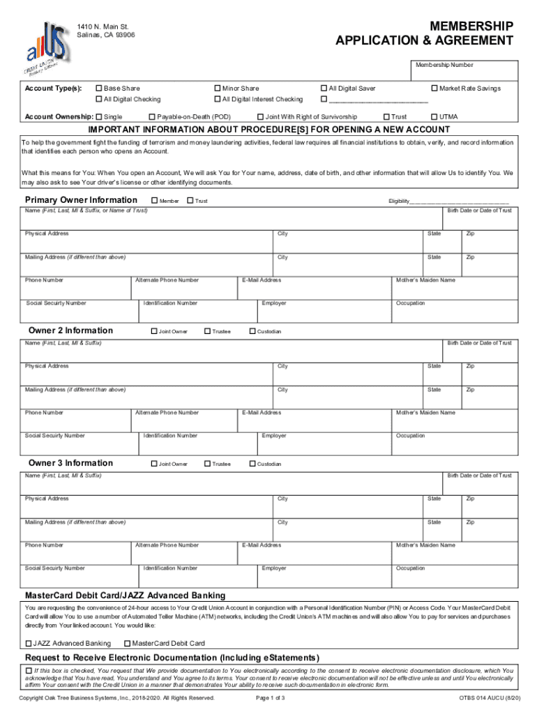 MEMBERSHIP APPLICATION & AGREEMENT1410 N. Main St. Salinas, CA 93906Membership NumberAccount Type(s):Account Ownership:Base Sharing Shall Digital Several Digital Checking Digital Interest Checking