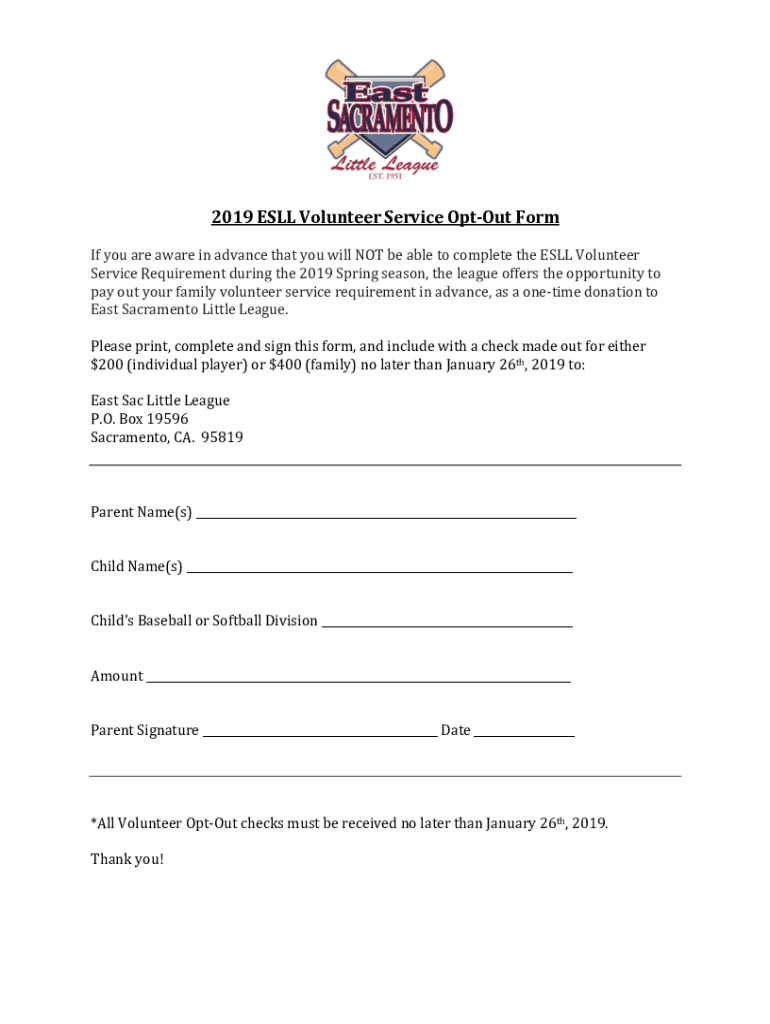 2019 ESL Volunteer Service Opt-out Formic you are aware in advance that you will NOT be able to complete the ESL VolunteerService Requirement during the 2019 Spring season, the league offers the opportunity