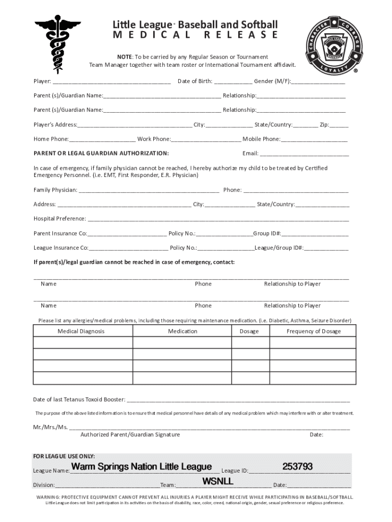 Little League Baseball and Softball M E D I C A LR E L E A SE NOTE: To be carried by any Regular Season or Tournament Team Manager together with team roster or International Tournament affidavit.