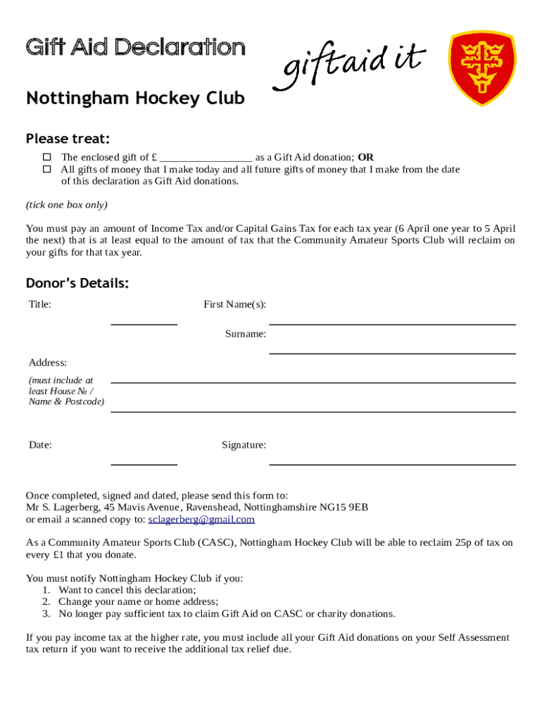 Gift Aid Declaration Nottingham Hockey Club Please treat: The enclosed gift of as a Gift Aid donation; OR All gifts of money that I make today and all future gifts of money that I make from the date