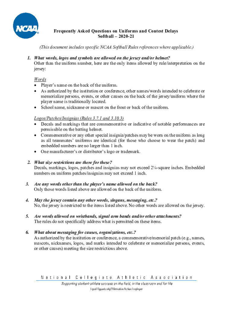 Frequently Asked Questions on Uniforms and Contest Delays Softball 202021 (This document includes specific NCAA Softball Rules references where applicable.) 1. What words, logos and symbols are allowed