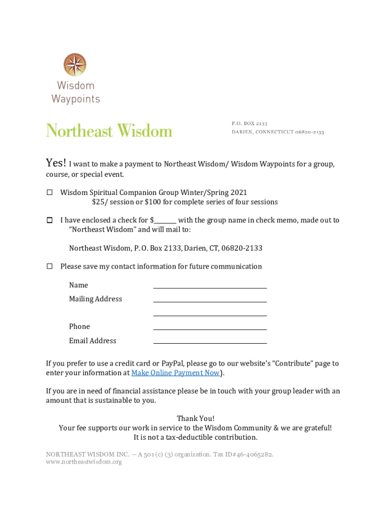 Yes! I want to make a payment to Northeast Wisdom/ Wisdom Waypoints for a group, course, or special event. Wisdom Spiritual Companion Group Winter/Spring $202125/ session or $100 for complete series